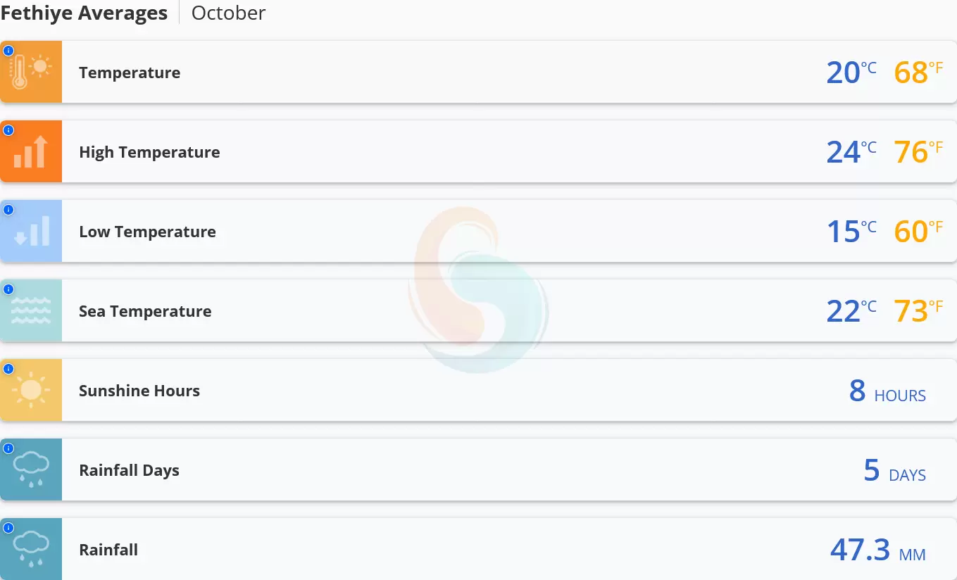En general, octubre ofrece condiciones climáticas agradables para unas vacaciones relajantes y placenteras en Fethiye, con temperaturas suaves, cielos soleados y una variedad de actividades para satisfacer las preferencias de cada viajero.
