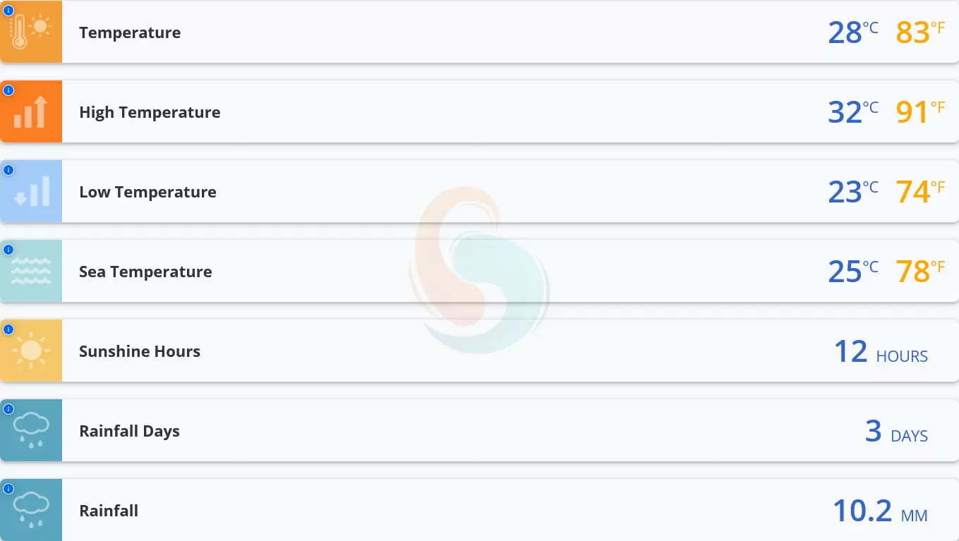 - Средняя дневная температура колеблется от 30°C до 35°C (от 86°F до 95°F).