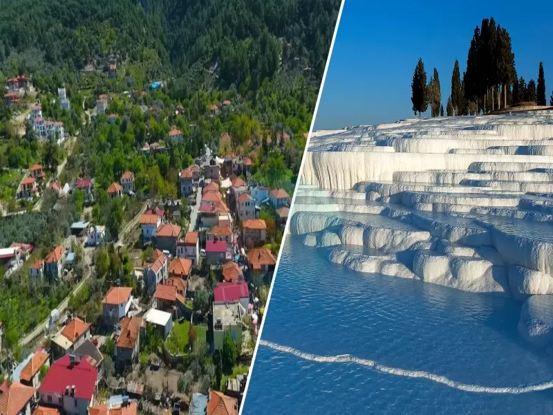 Sakin Yeşil Üzümlü köyünden büyüleyici doğa harikası Pamukkale'ye doğru büyüleyici bir yolculuğa çıkın. İster otobüsle, ister taksiyle, ister kiralık arabayla, manzaralı rotaları aşın ve Pamukkale'nin teraslarının ve antik kalıntılarının ruhani güzelliğine kendinizi kaptırın. Şifalı termal suların keyfini çıkarın, Hierapolis antik kentini keşfedin ve nefes kesen gün batımı manzaralarına tanık olarak bu büyüleyici destinasyonda unutulmaz anılar yaratın.